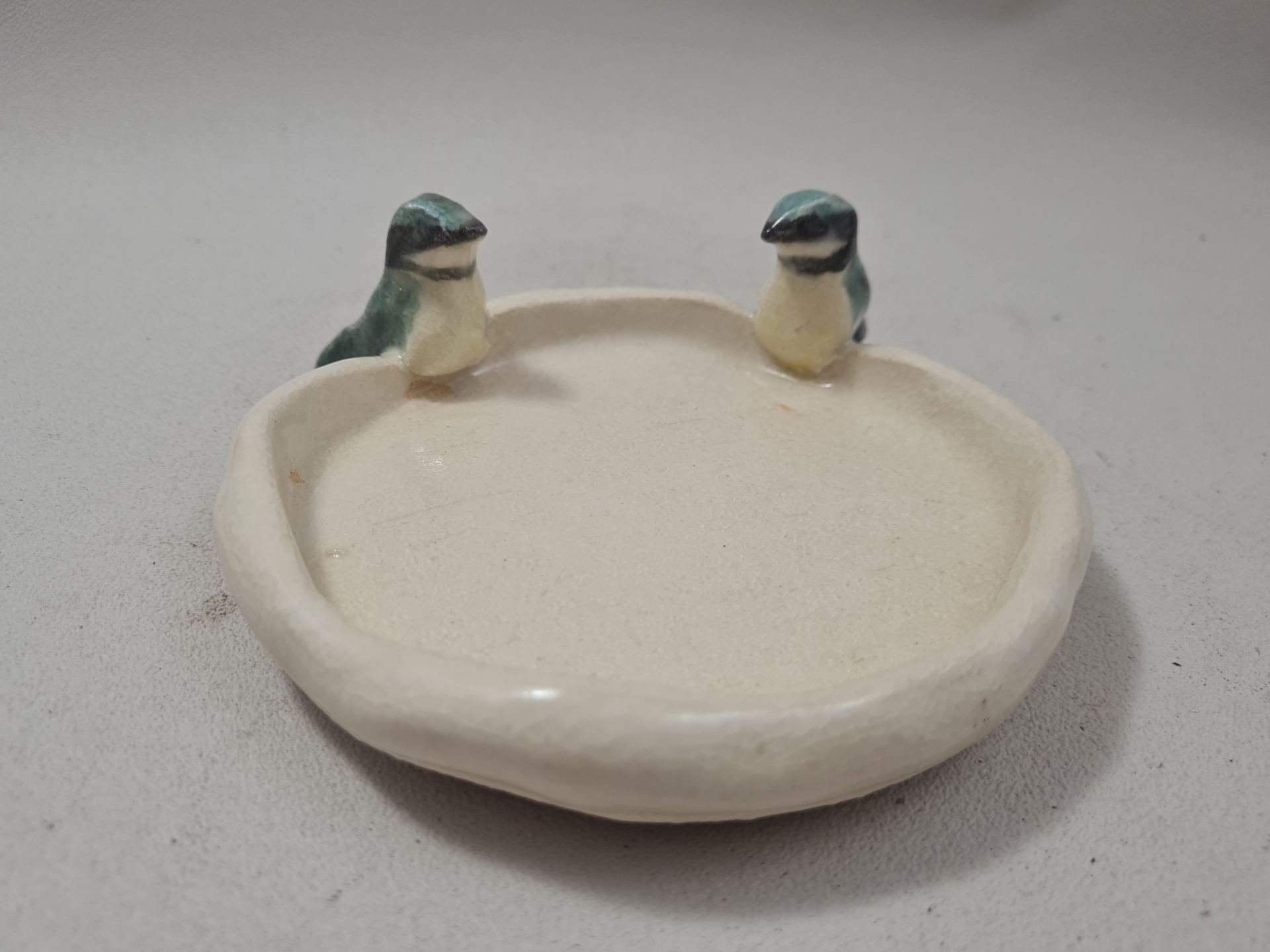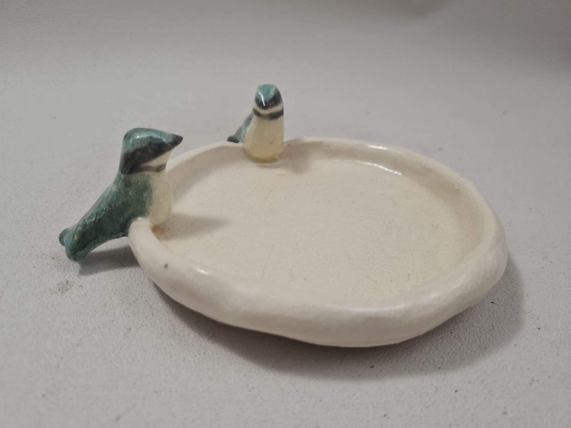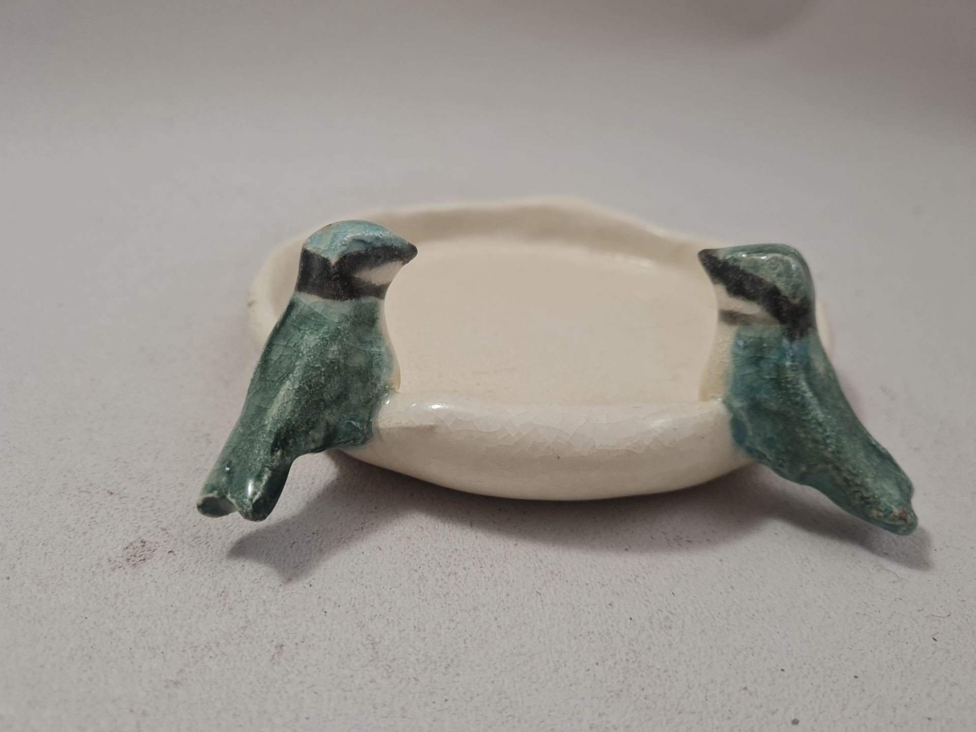 Assiette pour oiseaux en grès, décorée de deux mésanges