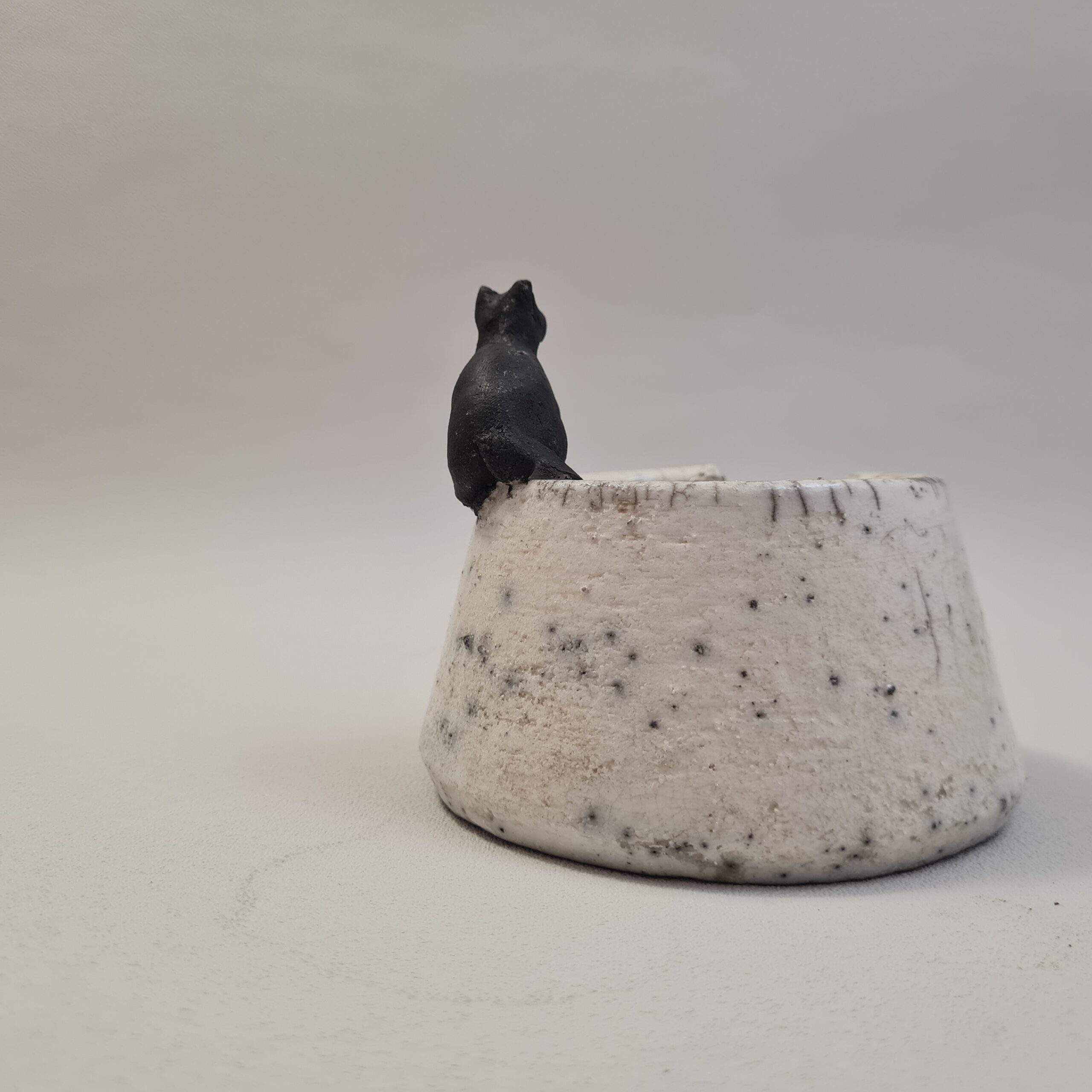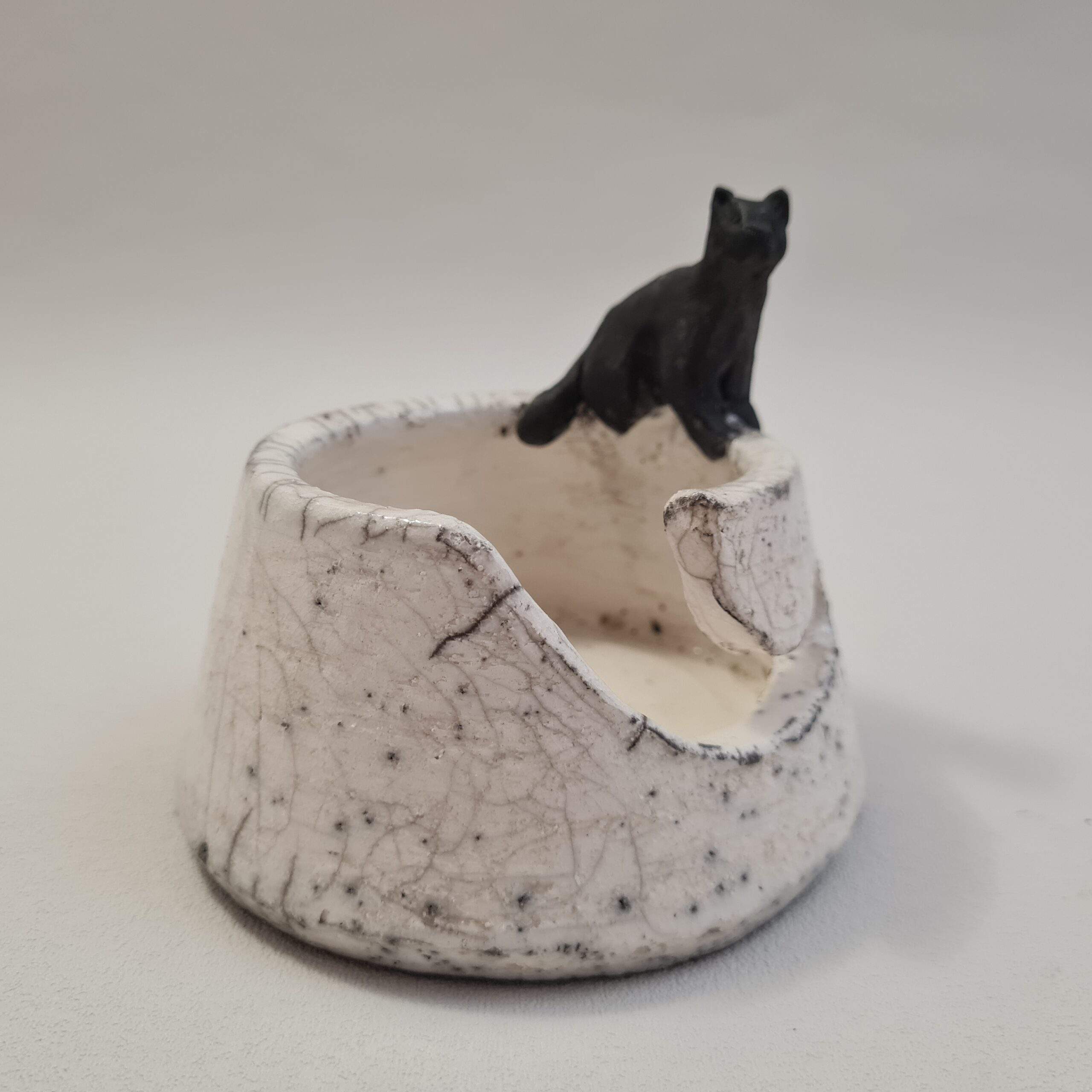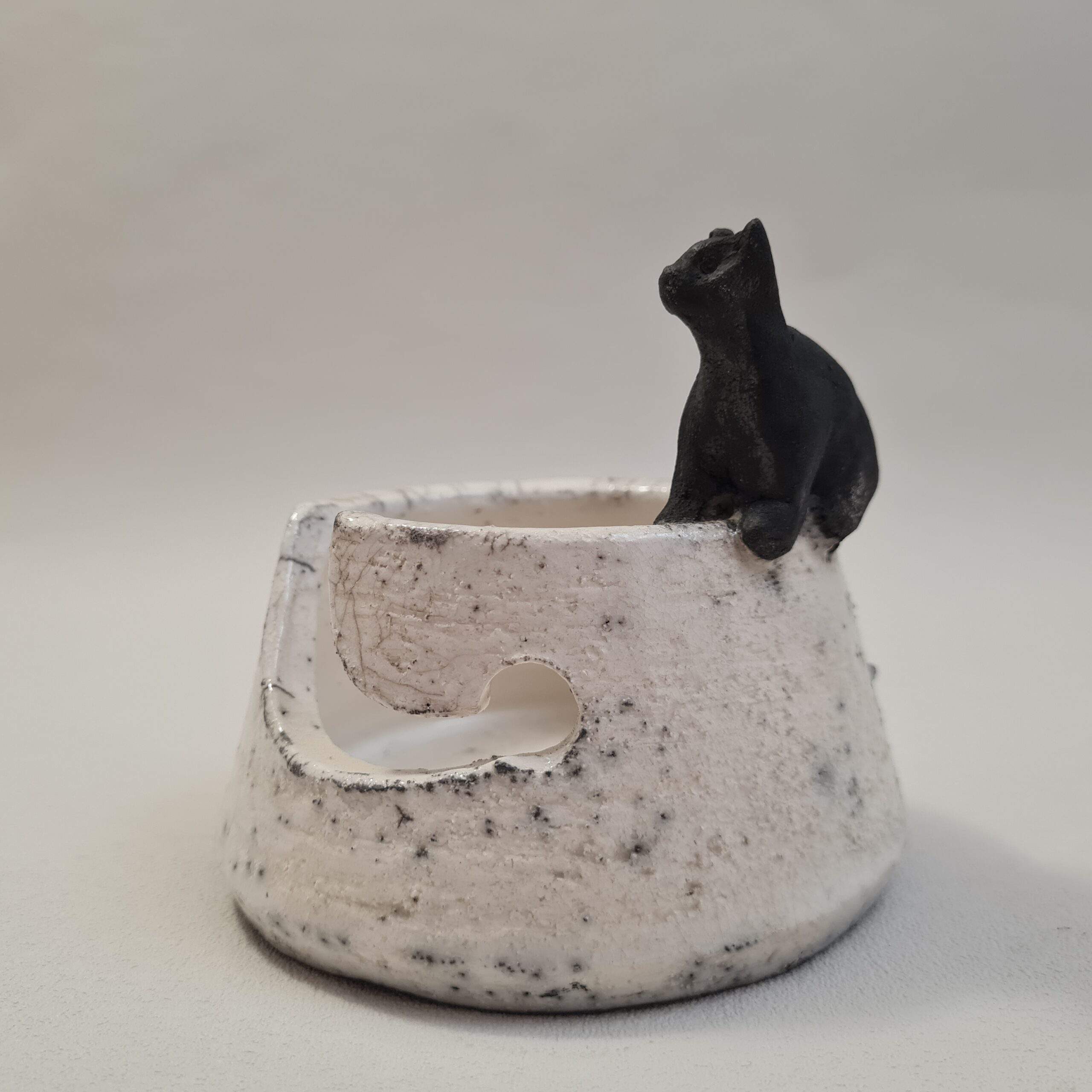 Bol conique découpé d’une virgule avec petit Chat noir assis sur le bord