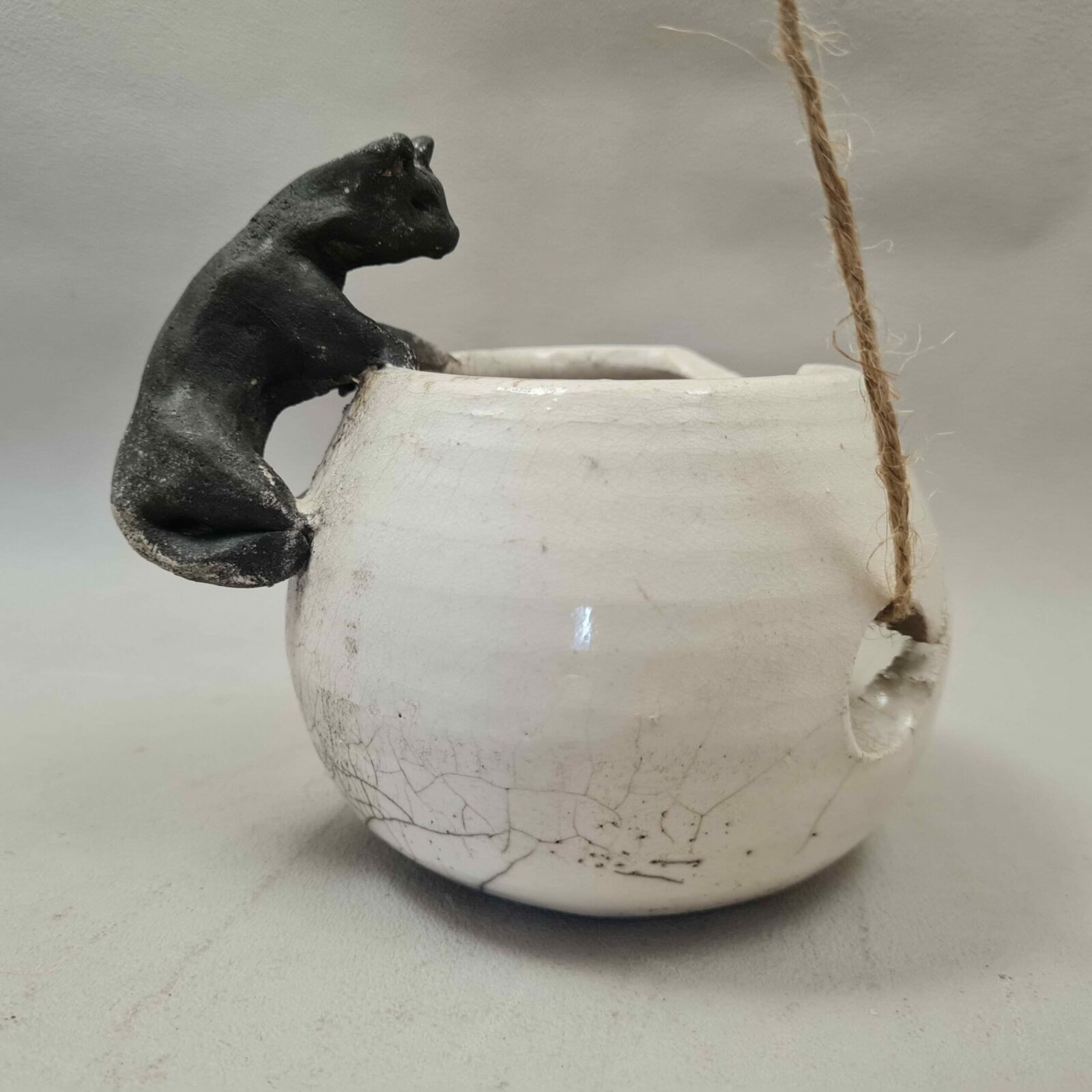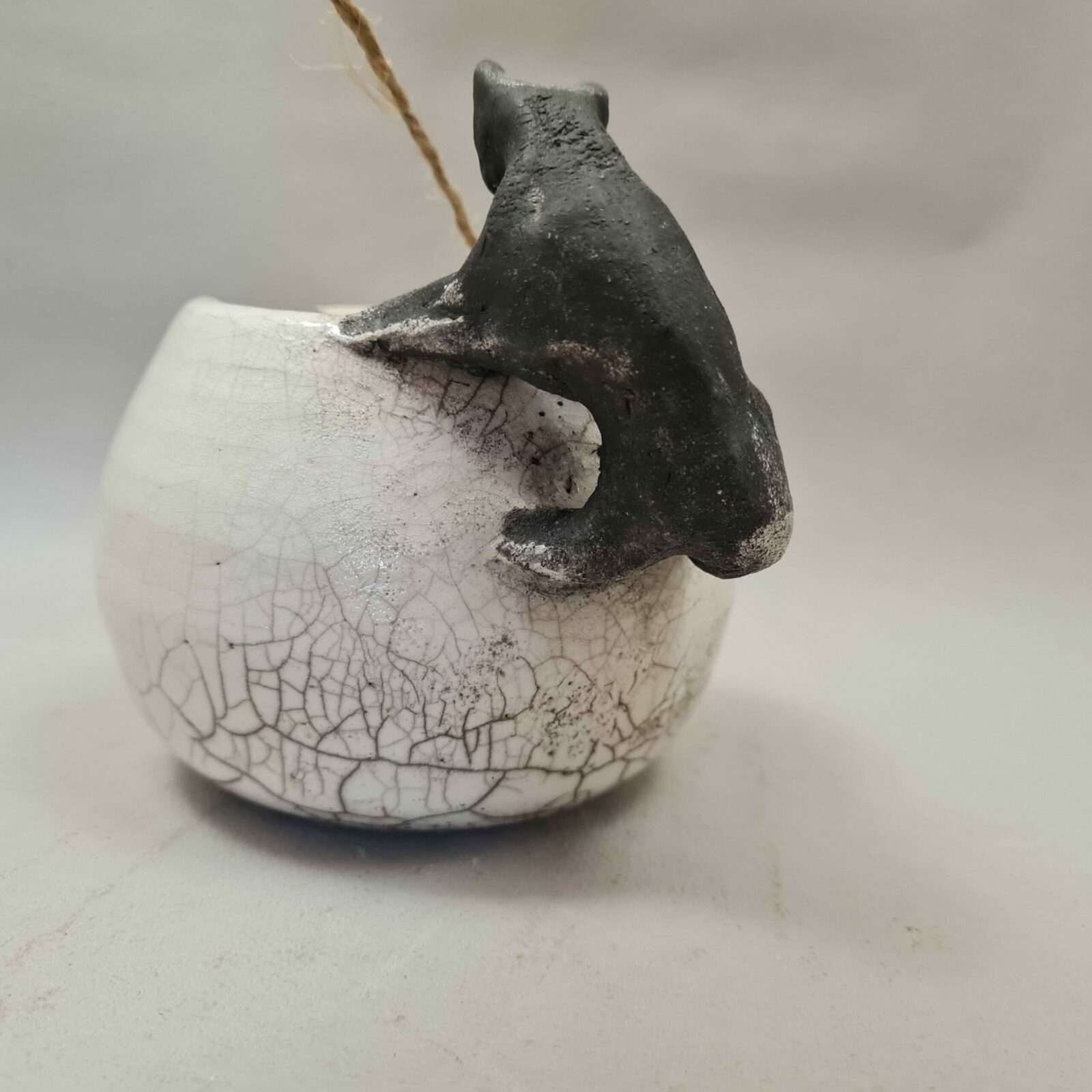 Bol à ficelle en raku, ouverture en virgule, avec petit Chat noir sur le bord