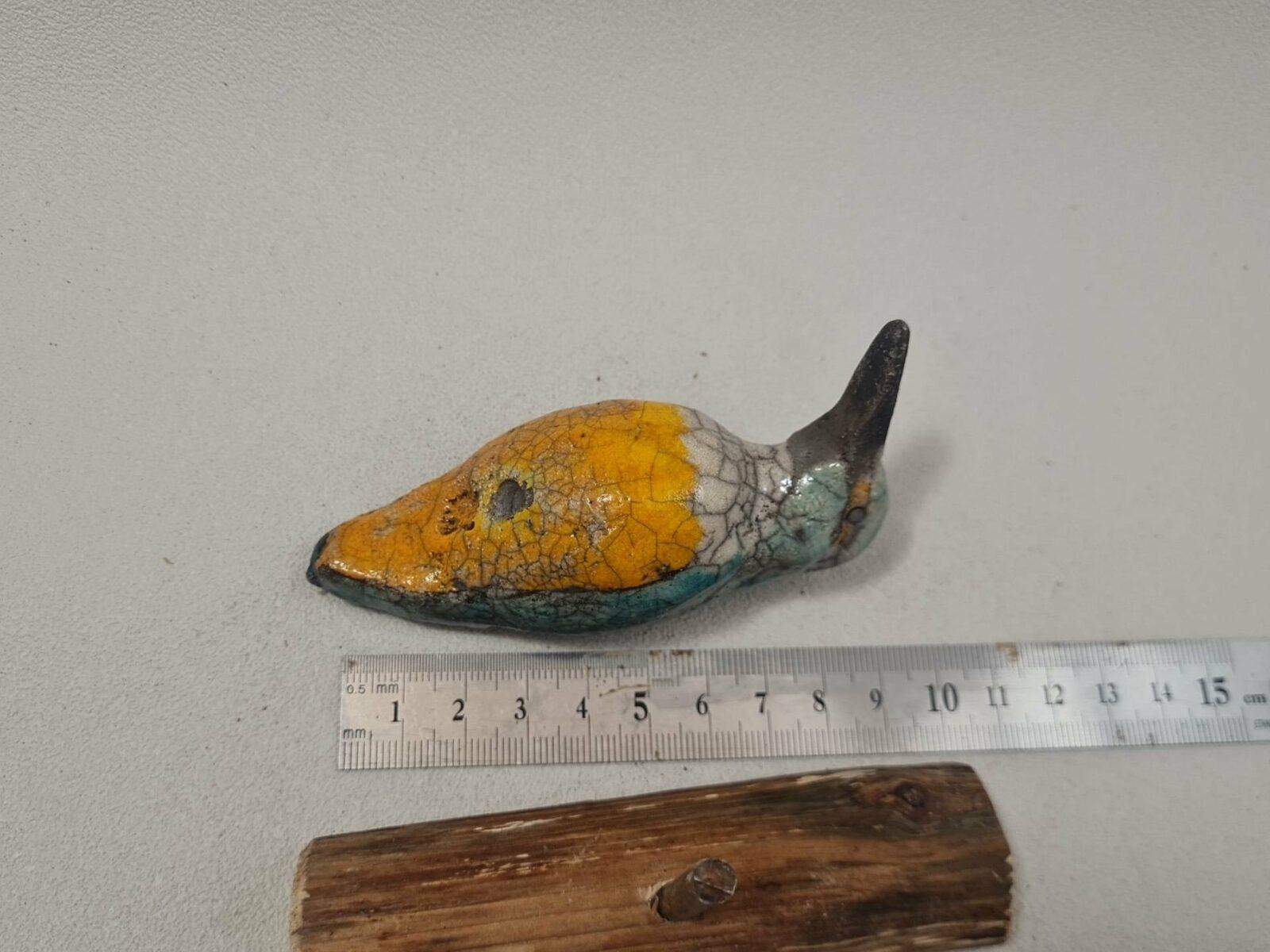 Corps et tête : 10 cm environ – bec 3 cm, largeur du corps : 4 cm – 130 gr