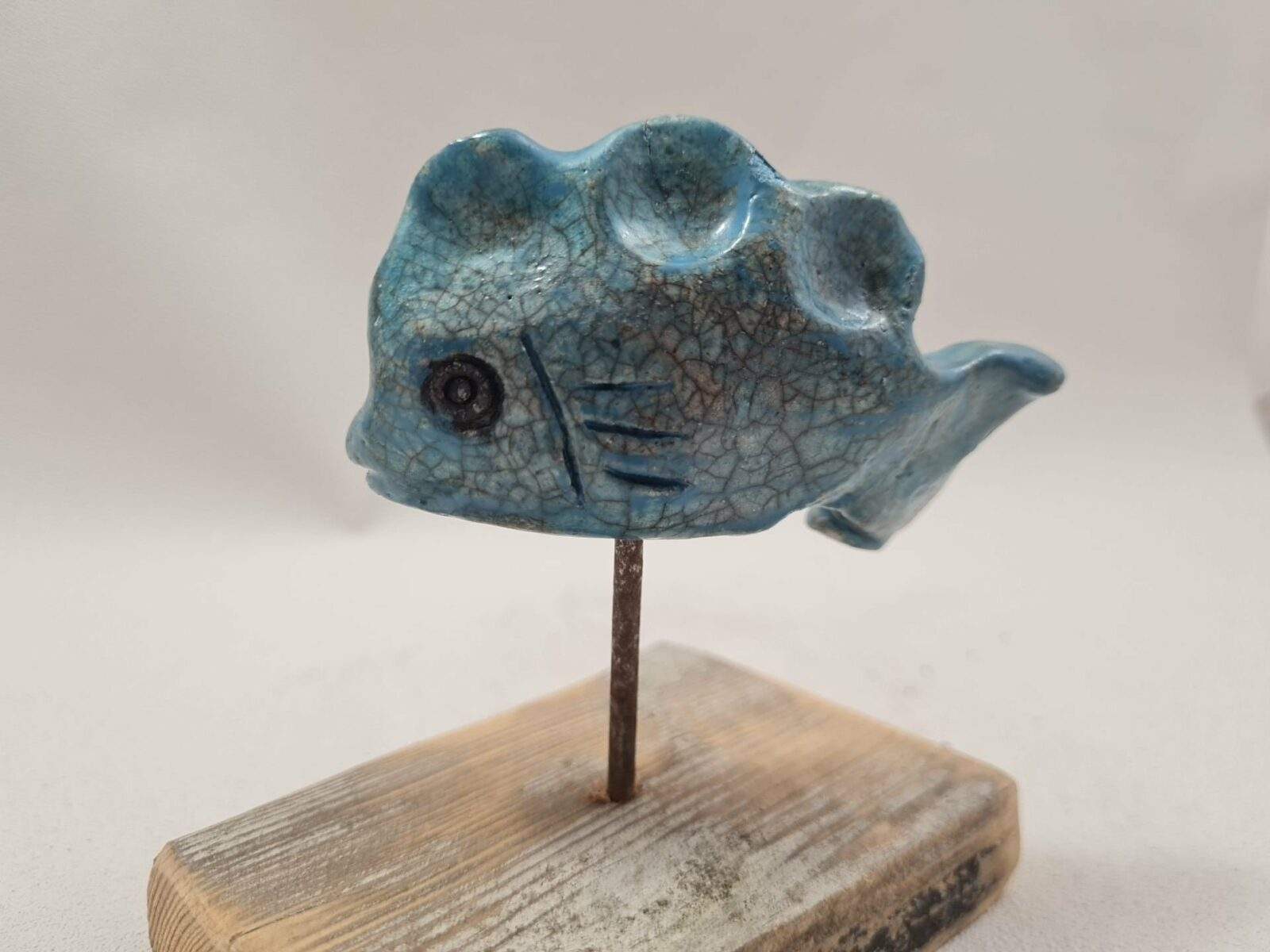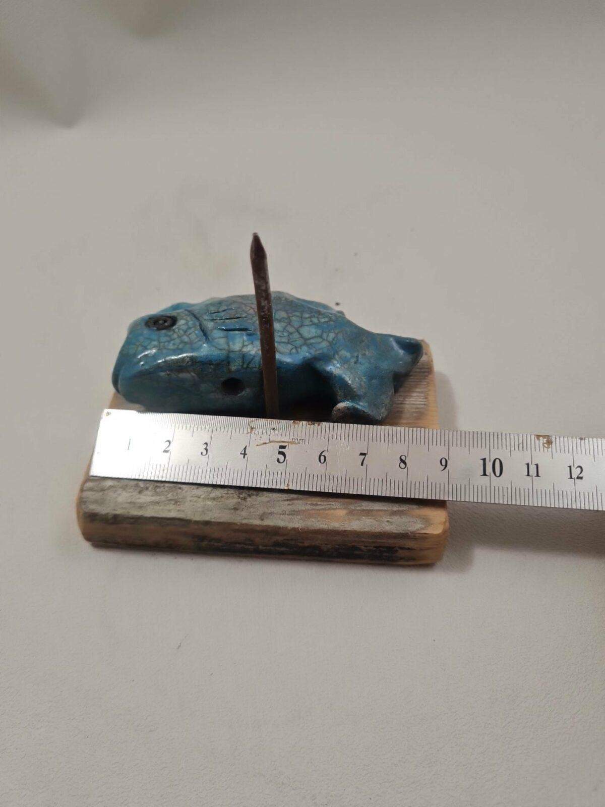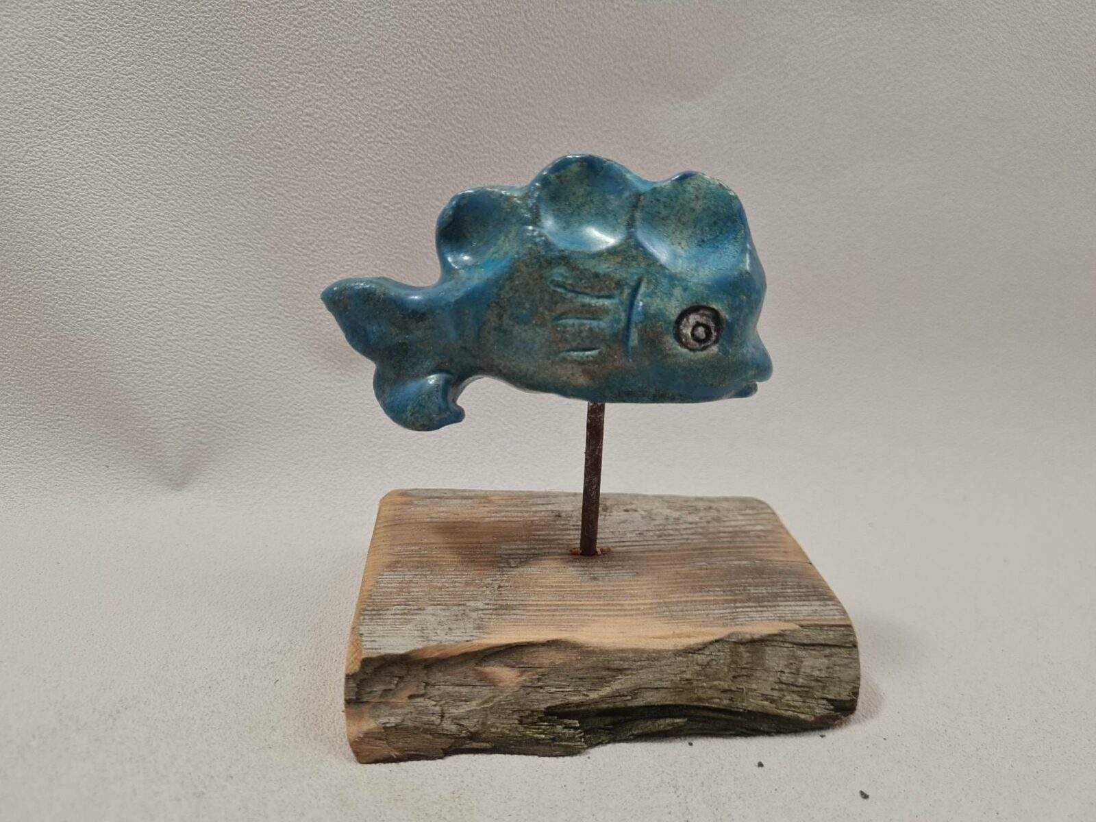 Le poisson a un trou sur son ventre qui lui permet d’être posé sur un socle en bois muni d’un clou sur lequel le poisson est piqué, je ne colle pas le poisson sur son support pour un transport plus facile.