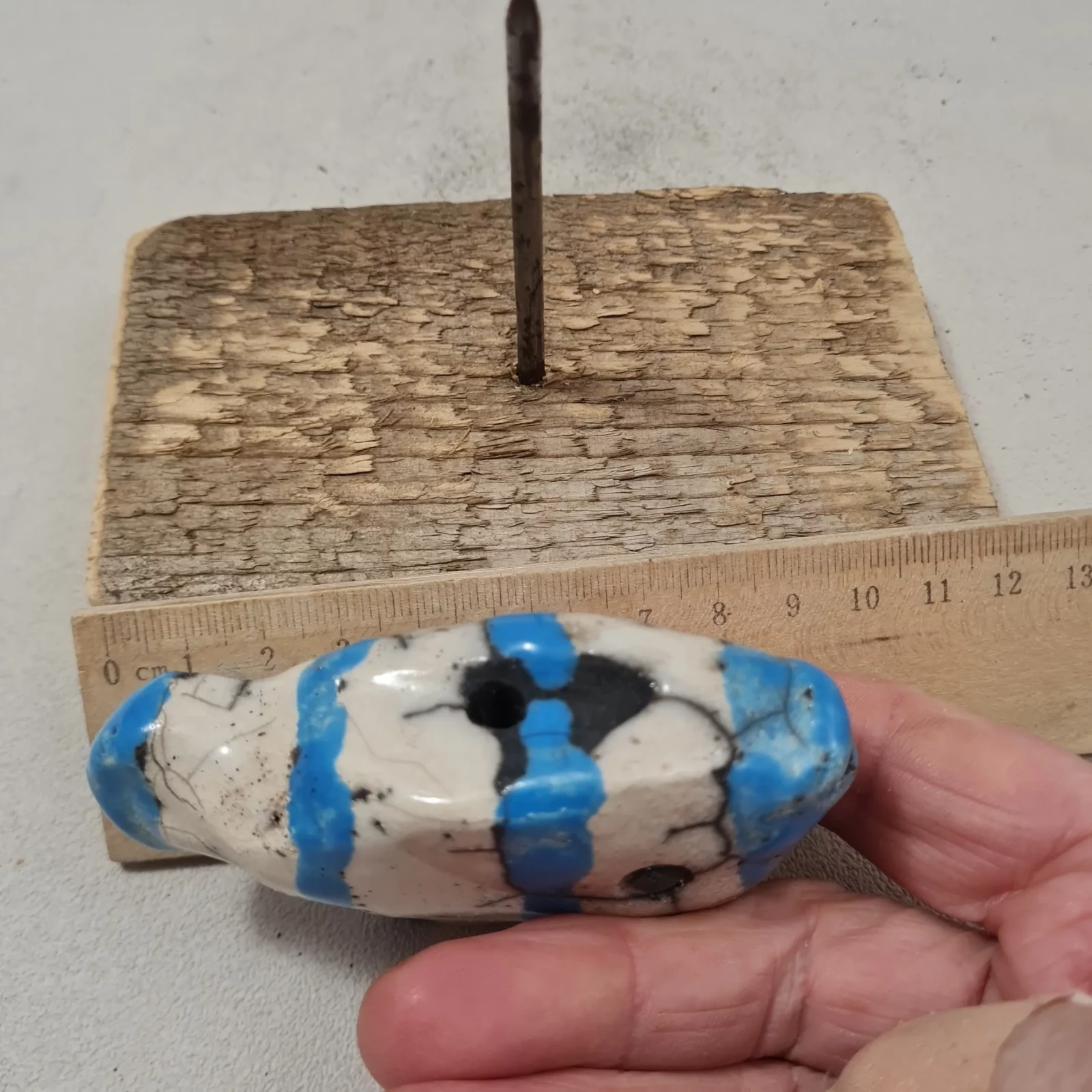 Le poisson a un trou sur son ventre qui lui permet d’être posé sur un socle en bois muni d’un clou sur lequel le poisson est piqué, je ne colle pas le poisson sur son support pour un transport plus facile.