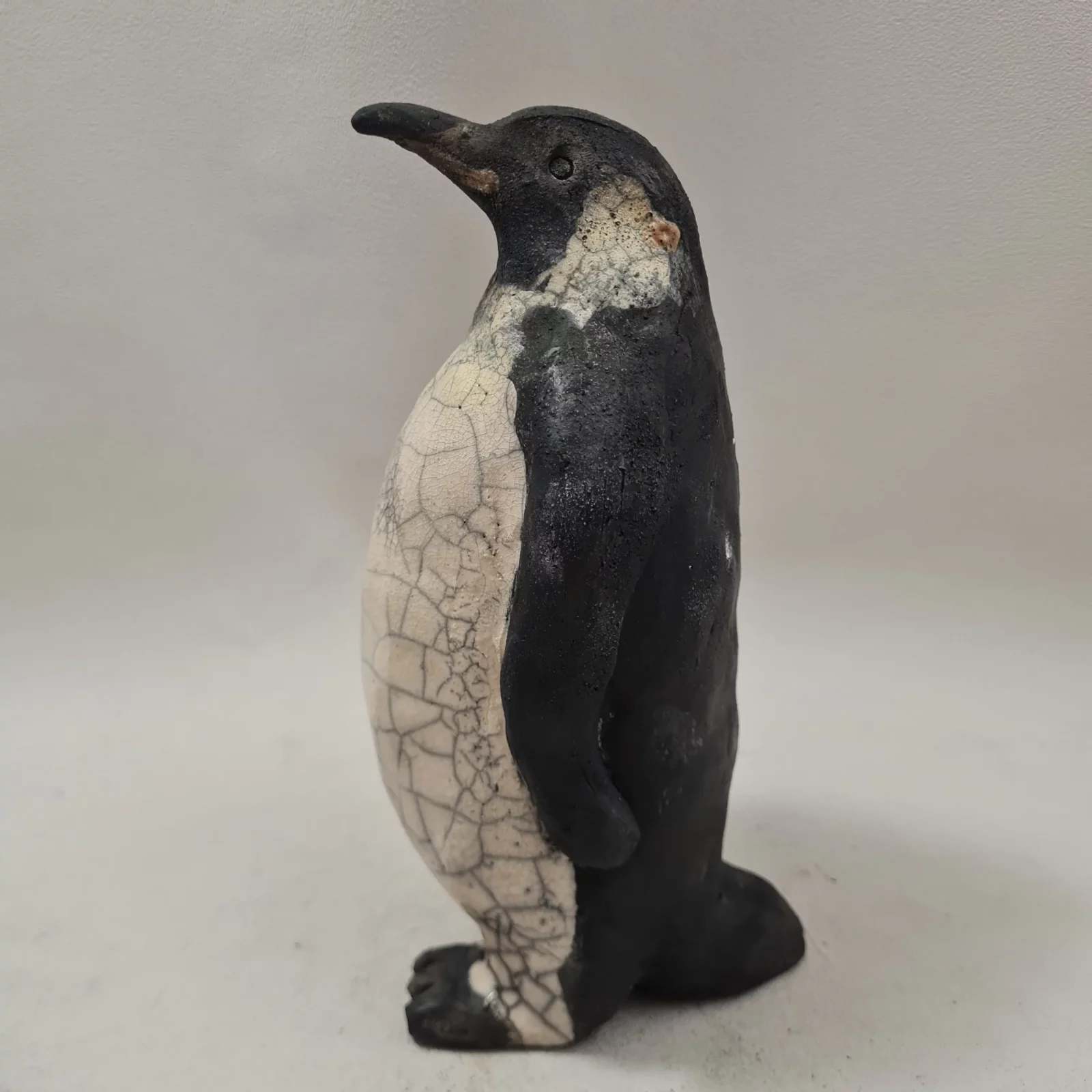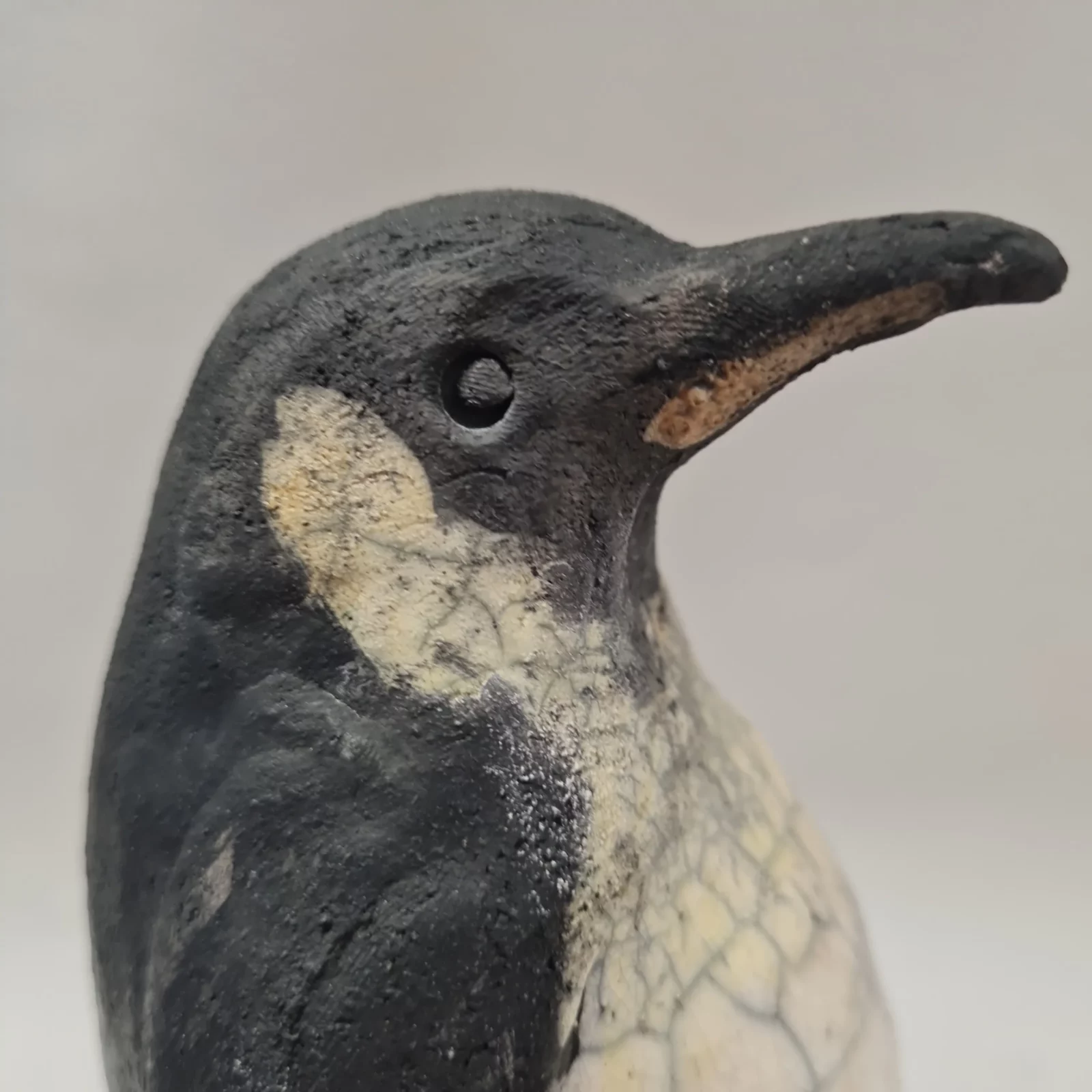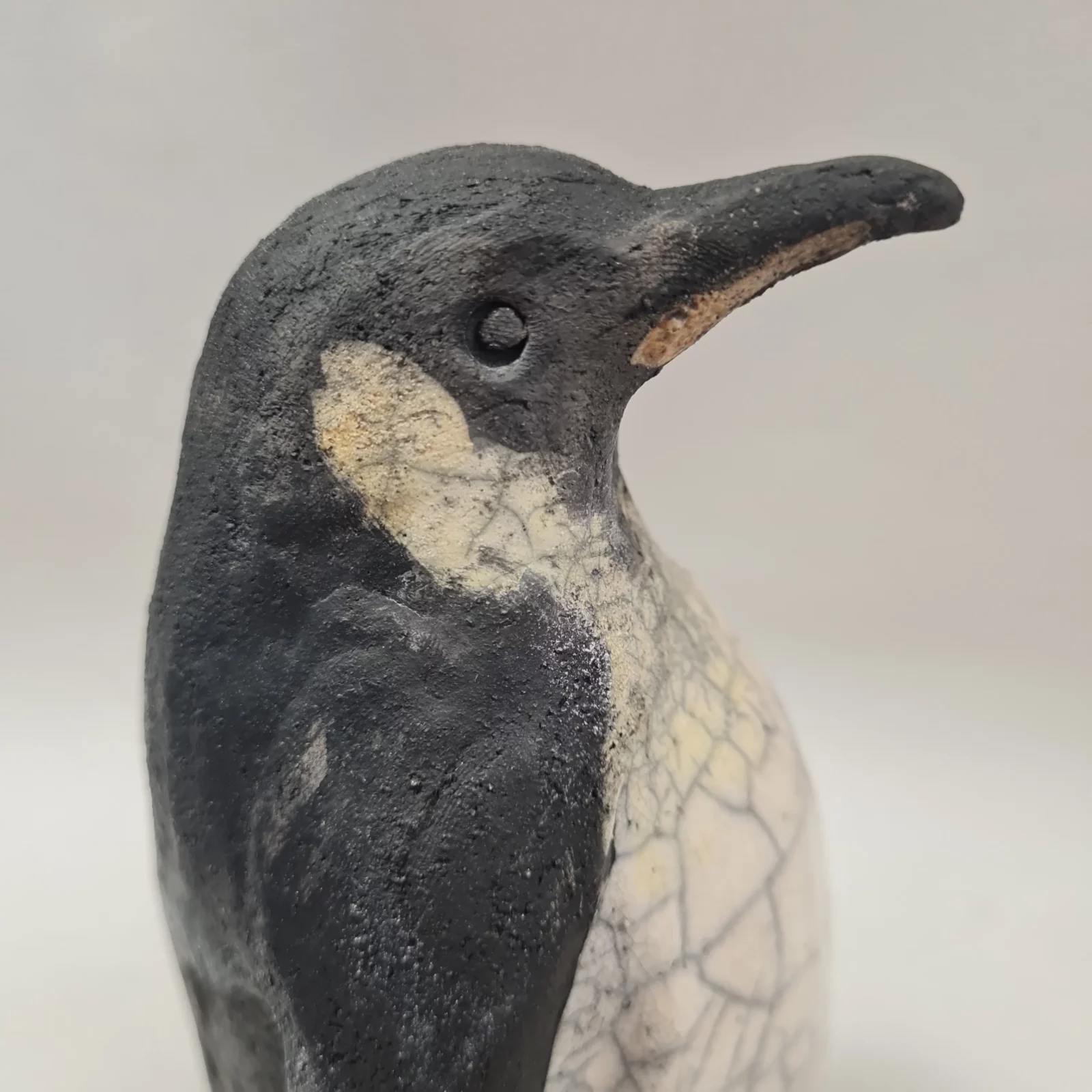🐧 Une sculpture de manchot empereur en céramique raku, élégante et expressive.